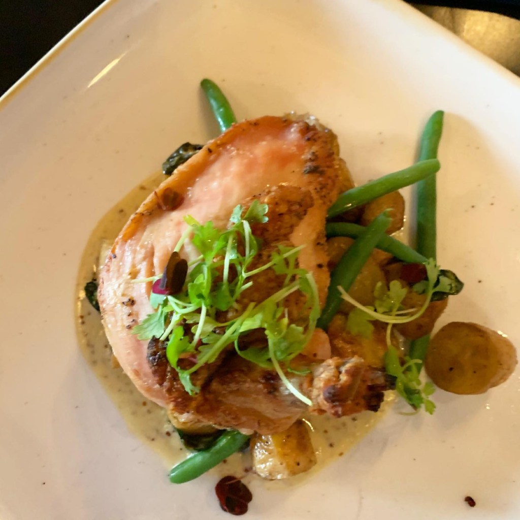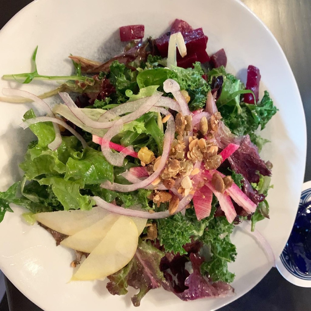 Hearty Mixed Greens, Toasted Pumpkin Seeds, Riesling-marinated Golden Raisins, Pink Lady Apples, and Maple-Balsamic Vinaigrette (Plant-based) Super delish and a big portion