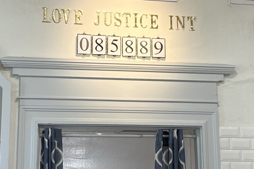 Above the bar, signage draws your attention to Love Justice International, a nonprofit dedicated to preventing human trafficking and protecting the vulnerable around the world.