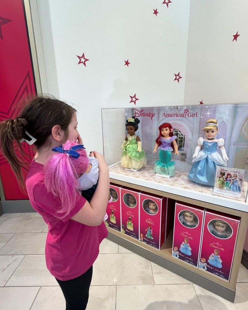 After checking out the whole store, she was able to narrow down her choices and pick a beautiful new Cinderella dress for her doll to wear for Disneyland ✨It was so much fun! Have you seen these sets? They are so beautiful and come with so many unique accessories. They are $55 each set and considering the quality and the accessories I feel like it’s a great deal . The dolls are $125 each but again such a great value for what you are getting!
