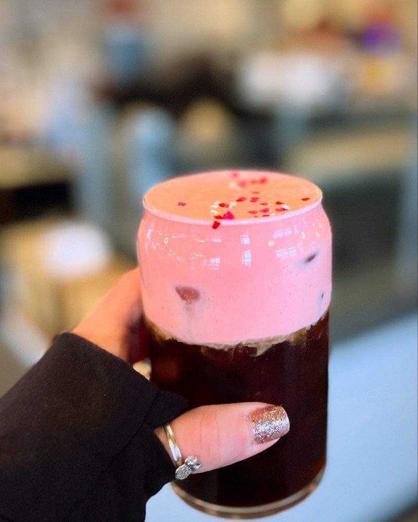 Check out this fun cold brew we ordered at @farm12puyallup Fika. The Cupid’s Cold Brew …yumm❤️ It was so good and even had tiny heart sprinkles!
