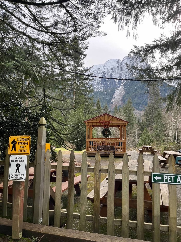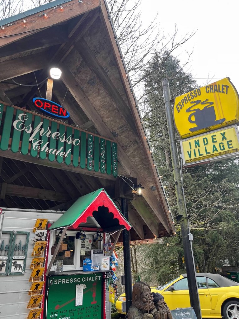 Espresso Chalet has one of the best views of Mount Index . It was the perfect stop to grab coffee after hiking Wallace Falls & Heybrook Lookout. Both hikes are within a few miles of each other with the Espresso Chalet between them. Look for the Bigfoot and you will know you are there.