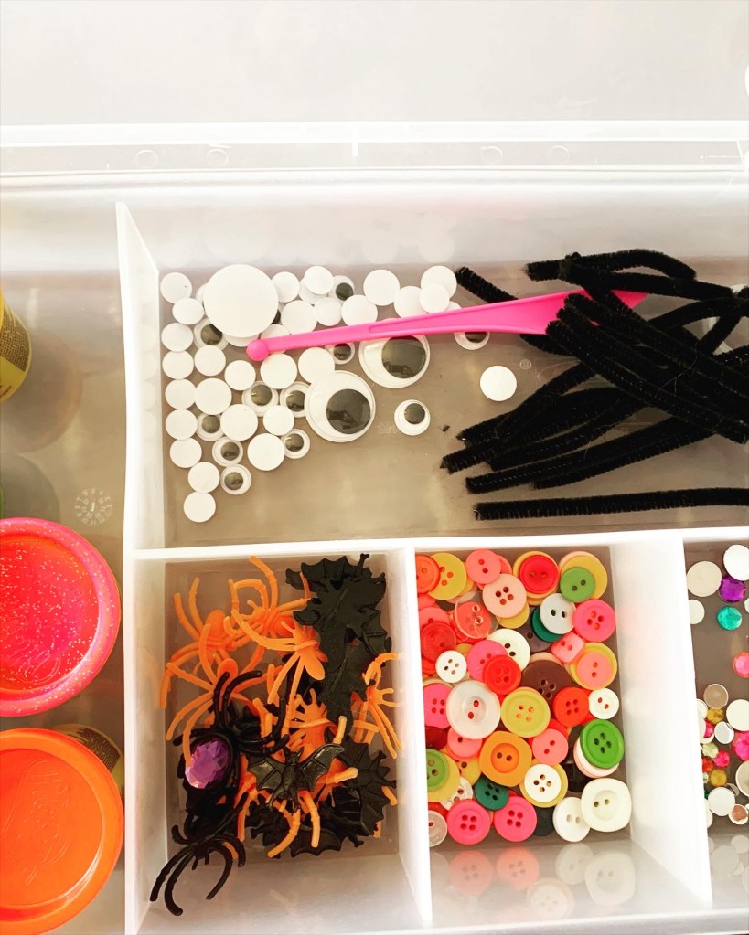 So I decided to take it up a notch and add some play-doh ( I also found sparkle play-doh ✨ ) and some fun things to mix in and create with like eyeballs, pipe cleaners, buttons, spiders, bats and jewels