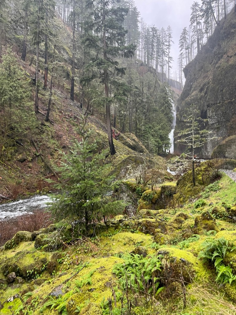 If you want to add another short hike to Pony Tail Falls (Horsetail Falls #438) you will follow the trail to the left . It is a bit steep at first but itโs short so hang with it because when you come around a bend there is a beautiful waterfall that is in sight and feeds the Horsetail Falls. It cascades over a cliff and you can walk behind it . There is a beautiful pool that in the summer we have played in. Itโs almost like a hidden poolโฆSo beautiful!