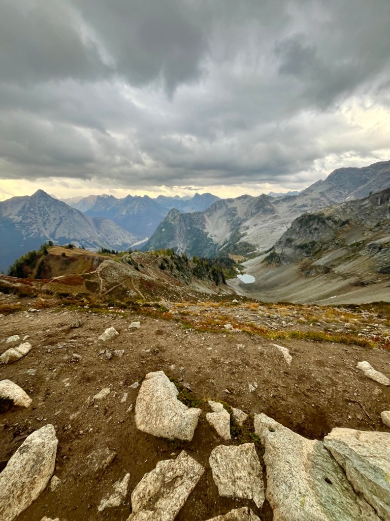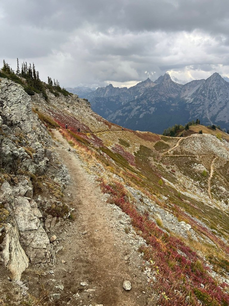 Descending Maple Pass is so beautiful! You see the path as it zigzags along the mountainside and everywhere you look you see mountains. If you look closely you will see other hikers who look like little specks .