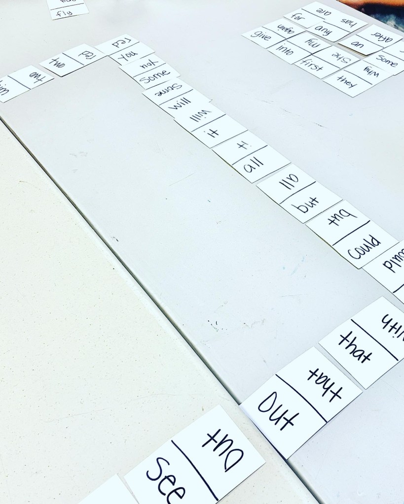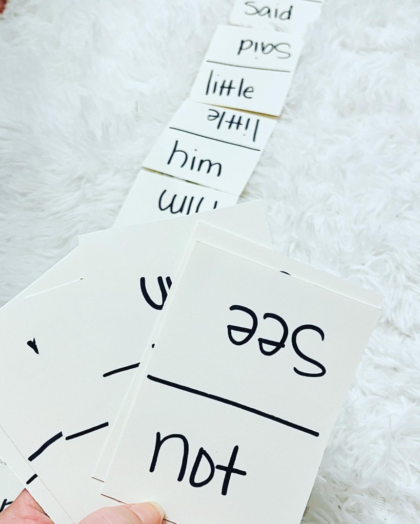 I picked up a pkg of poster board sheets at the Dollar tree . I then wrote the sight words we are learning as well as more challenging ones , cut them out and that’s it! Ready to play.
