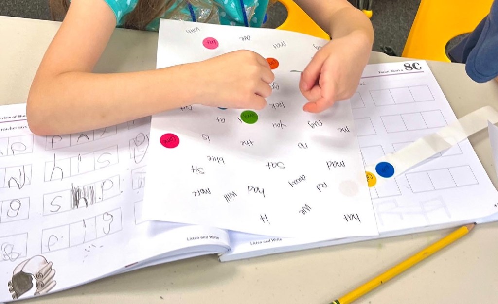This was a fun activity to work on for sight word recognition. Make a sheet of various sight words and coordinate dot stickers with the same sight word . As you call out the sight word , the students will find the sticker , then locate on their paper and cover up the word with the sticker.